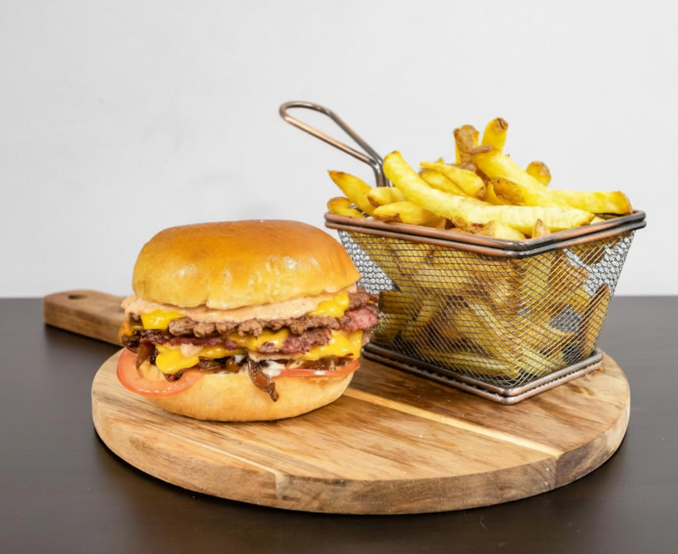 Accueil / Burgers frites / Double Smash Burger Double Smash Burger21,00 € 2 steaks smasher, 2 fromages parvé, garniture et 2 sauces au choix. Servi avec frites et 2 sauces pour frites au choix. Sauces au choix Burgers *📊 Maximum : 2 suppléments maximum Ketchup Mayonnaise Barbecue Pesto Darka Piment Moutarde au Miel AucuneCrudités *📊 Maximum : 1 supplément maximum Salade Tomates Oignons Cornichons AucuneSuppléments *📊 Maximum : 1 supplément maximum Oignons crispy (+1.00 €) Oignons confits (+1.00 €) Guacamole (+1.50 €) Cheddar (+1.50 €) Œuf au plat (+1.50 €) AucunSauces au choix pour frites *📊 Maximum : 2 suppléments maximum Ketchup Mayonnaise Barbecue Pesto Darka Piment Moutarde au Miel AucuneSauces supplémentaires * (maximum 7 choix) Ketchup (+0.50 €) Mayonnaise à L'ail (+0.50 €) Barbecue (+0.50 €) Pesto (+0.50 €) Darka (+0.50 €) Piment (+0.50 €) Moutarde au Miel (+0.50 €)TEST * OUI NON💬 Ajouter un commentaire (optionnel) : quantité de Double Smash Burger Ajouter au panier Catégorie : Burgers frites Produits similaires Chicken Burger 17,00 € Choisir Burger Classique 17,00 € Choisir Smash Burger 17,00 € Choisir Triple Smash Burger 25,00 € Choisir