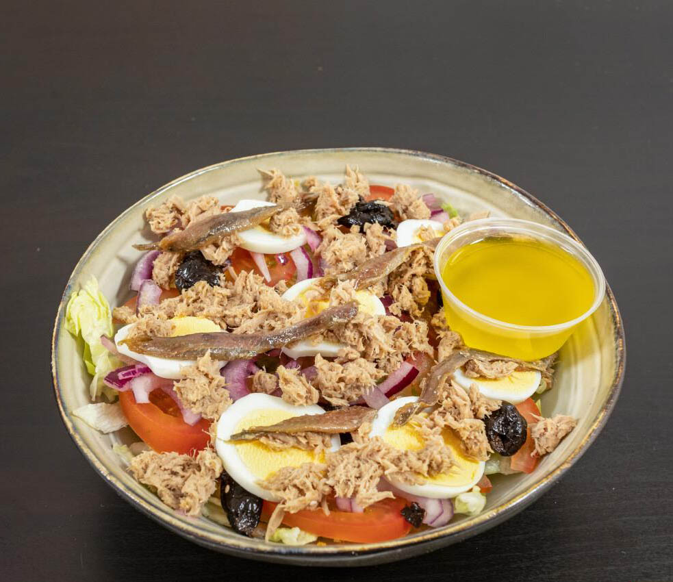 Accueil / Salades / Salade Niçoise Salade Niçoise14,00 € Salade verte, tomates, oignons, anchois, thon, olives noires et huile d’olive citron à côté. quantité de Salade Niçoise Ajouter au panier Catégorie : Salades Produits similaires Salade Entrecôte 23,00 € Ajouter au panier Salade Poulet Pané 15,00 € Ajouter au panier